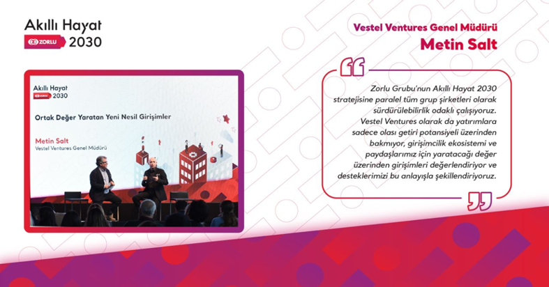Zorlu Holding olarak destekçisi olduğumuz StartupsWatch Türkiye Girişim Ekosistemi Yıllık Etkinliği'nde Vestel Ventures Genel Müdürümüz Metin Salt, Zorlu Grubunda benimsenen “Ortak Değer Yaratan Yeni Nesil Girişimcilik” yaklaşımını ve bu kapsamda hayata geçirilen çalışmaları aktardı. Salt; "Zorlu Grubu’nun Akıllı Hayat 2030 stratejisine paralel tüm grup şirketleri olarak sürdürülebilirlik odaklı çalışıyoruz. Vestel Ventures olarak da yatırımlara sadece olası getiri potansiyeli üzerinden bakmıyor, girişimcilik ekosistemi ve paydaşlarımız için yaratacağı değer üzerinden girişimleri değerlendiriyor ve desteklerimizi bu anlayışla şekillendiriyoruz" diyor.
